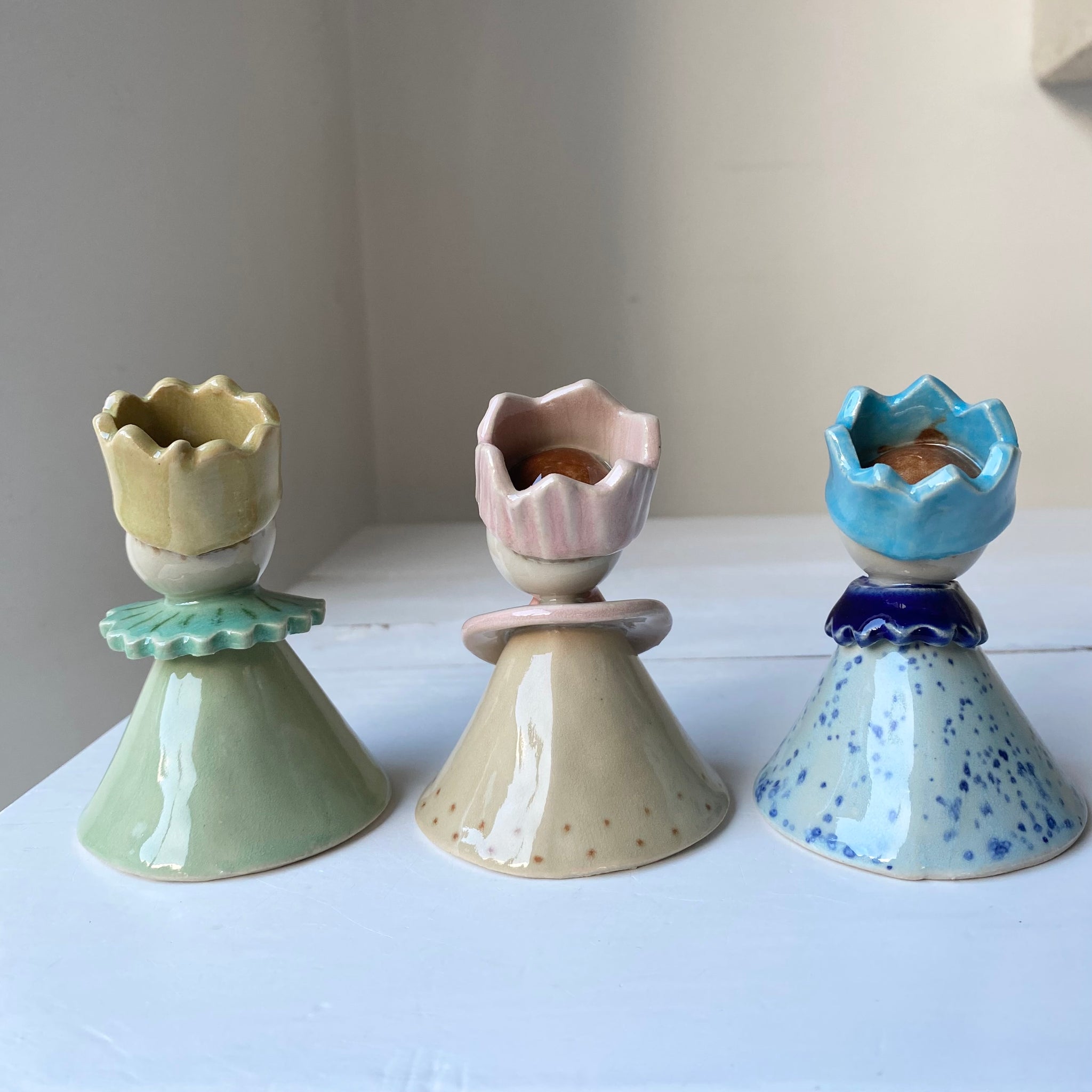 Vi håndformer og håndmaler alle tre figurer selv, på vores værksted på Fyn. Derfor kan der være små forskelligheder fra figur til figur. Det er både i dekoration og form.