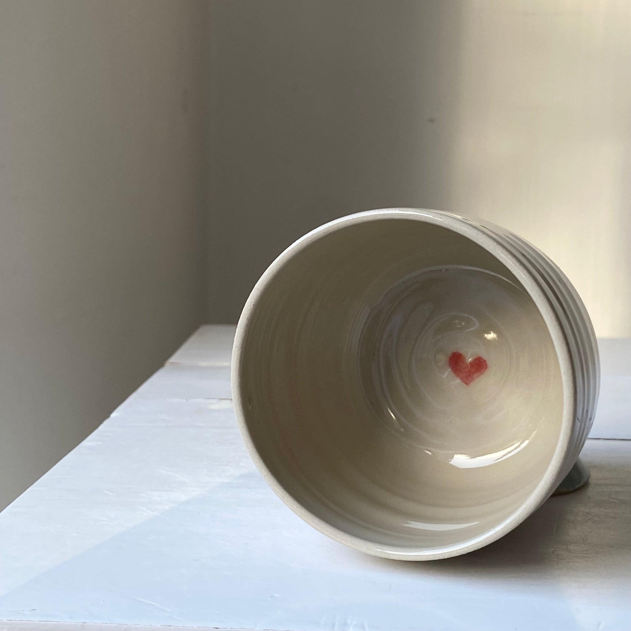 Vi har strøet en masse små fine kristjørnbær og hjerter  ud over denne kop og malet et lille rødt hjerte i bunden indeni.