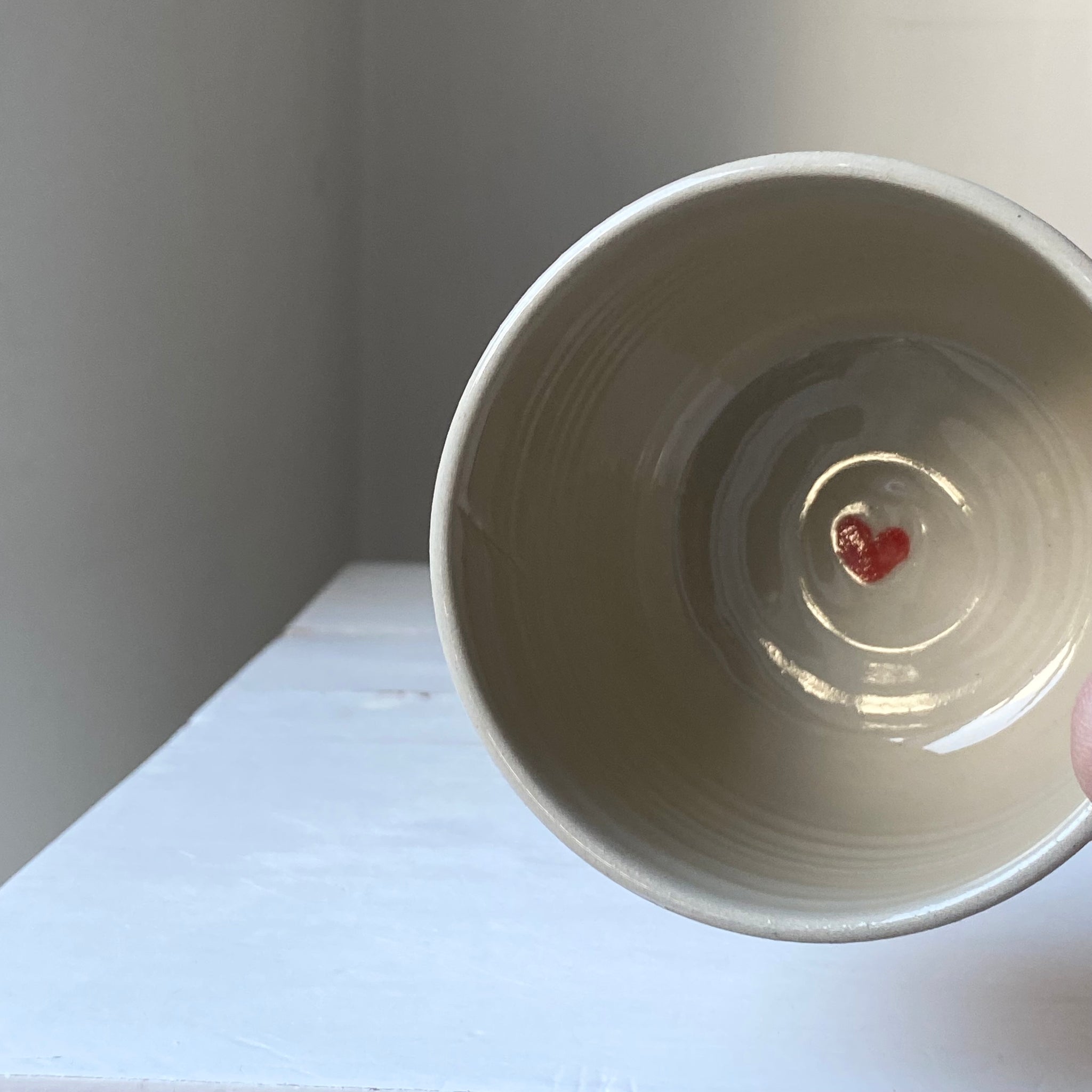 Vi har strøet en masse små fine kristjørnbær og hjerter ud over denne kop og malet et lille rødt hjerte i bunden indeni.