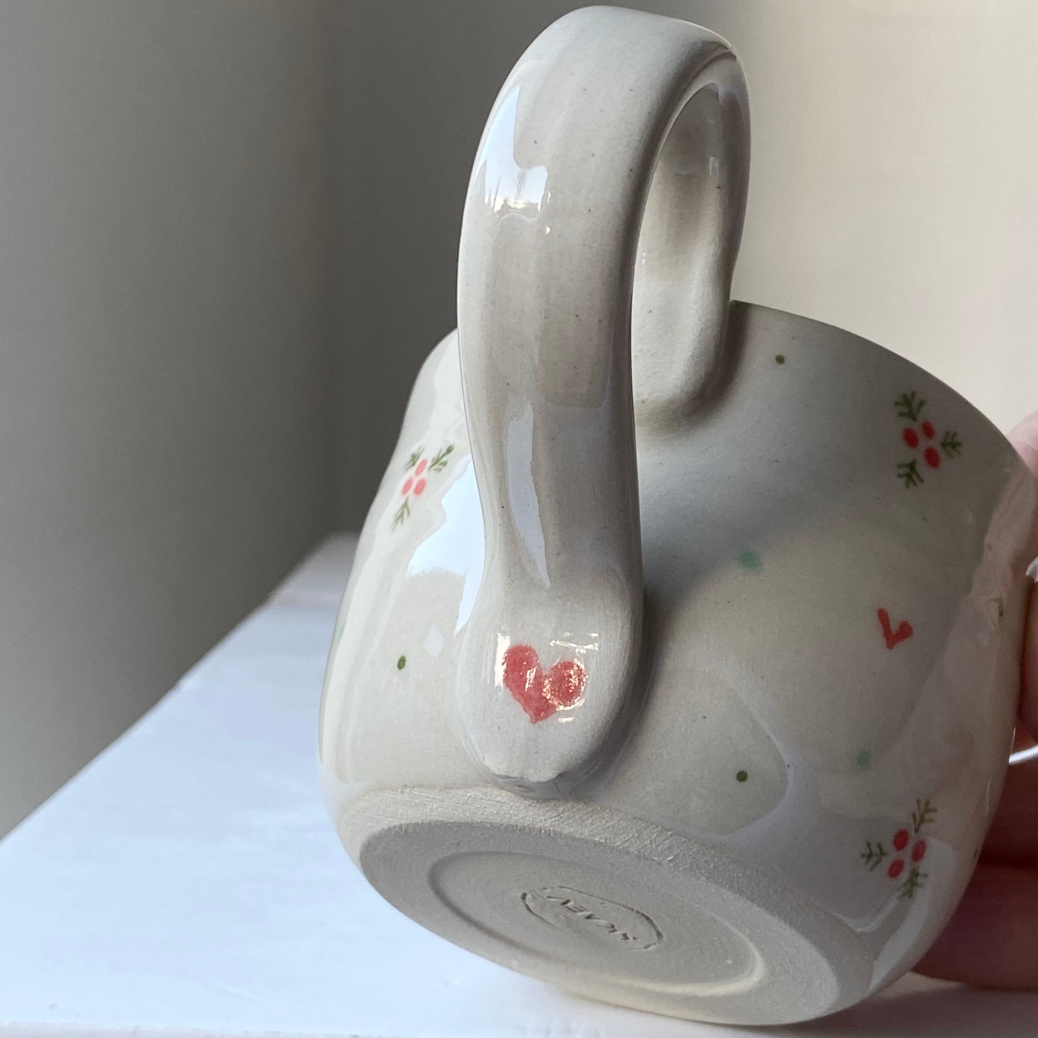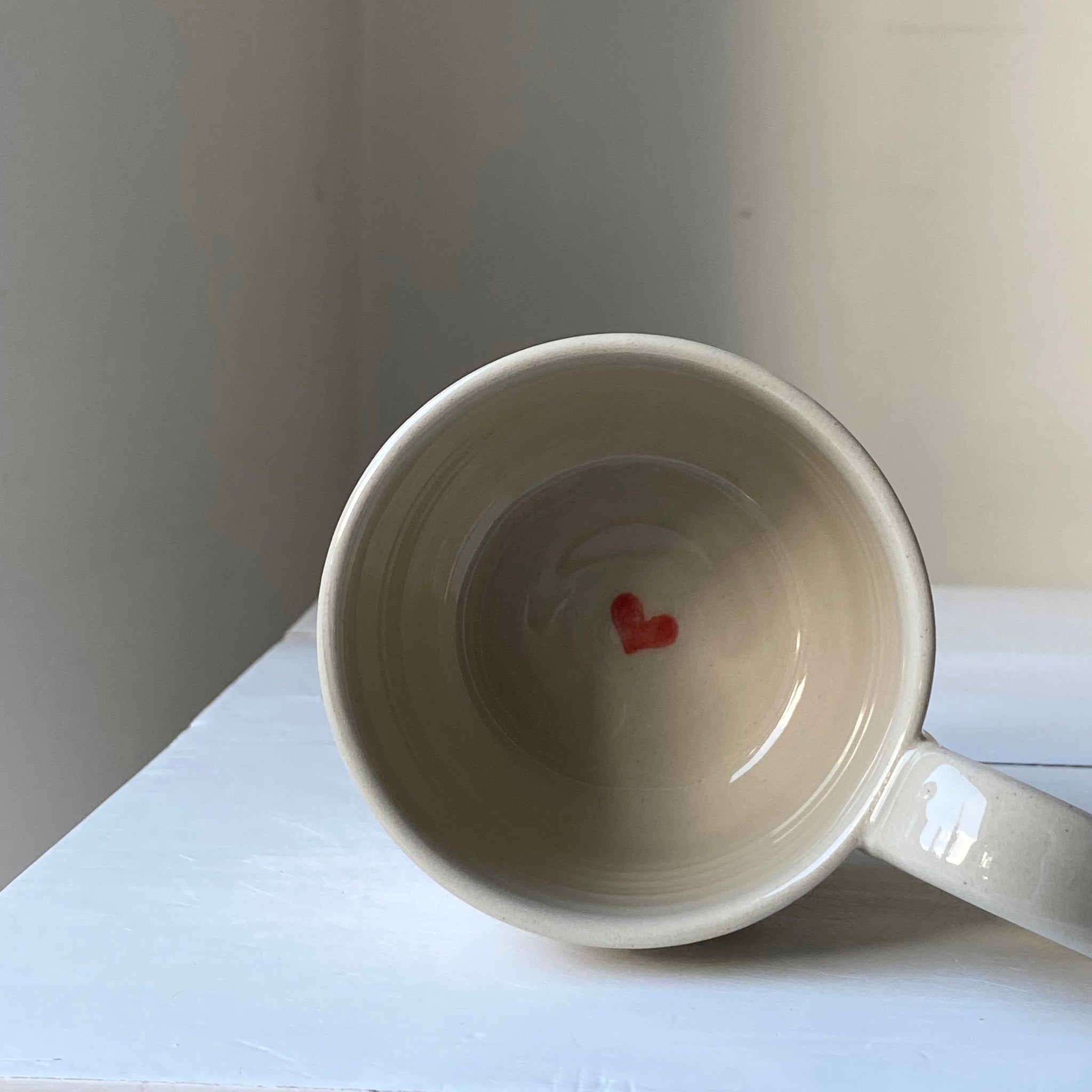 Vi har strøet en masse små fine kristjørnbær og hjerter ud over denne kop og malet et lille rødt hjerte i bunden indeni.
