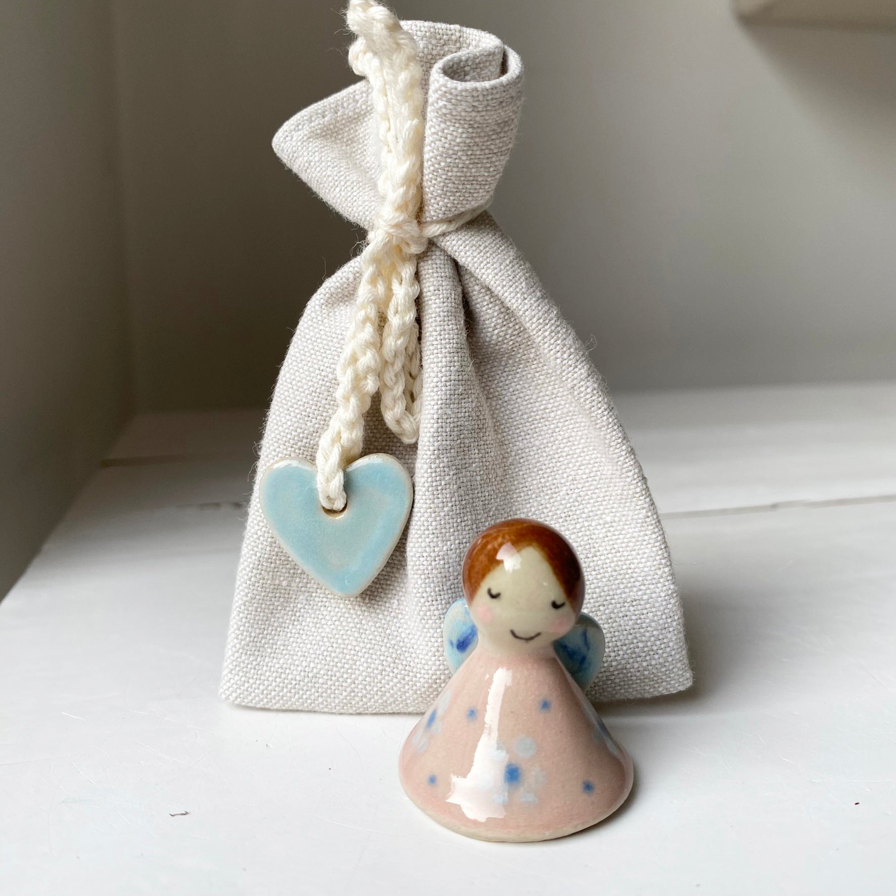 Håndformet og håndmalet engel i stentøjsler  💛  i håndsyet pose / MINI