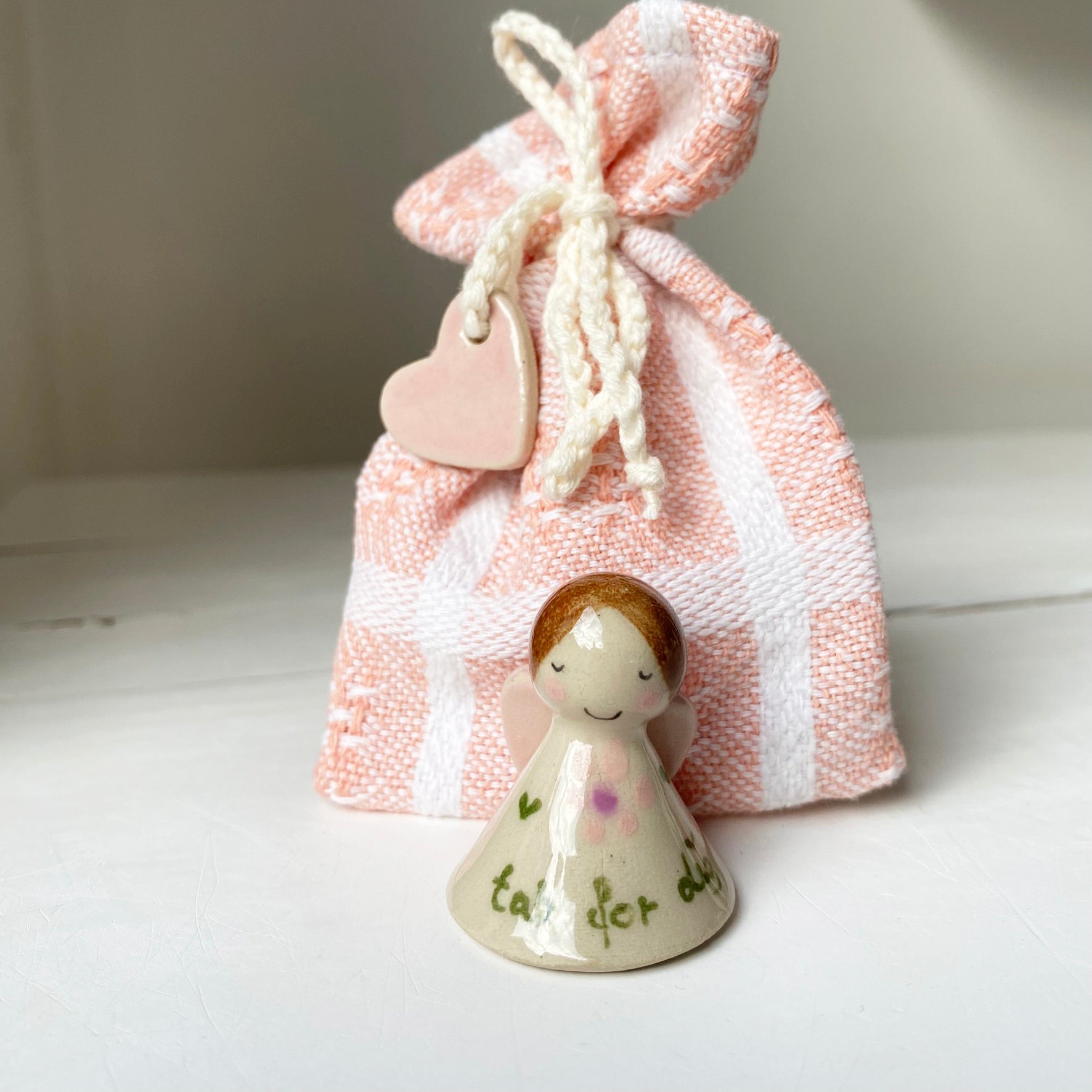 Vi har syet en stofpose til denne lille, bitte engel. Posens stof er lavet af gamle, smukke duge, som vi har købt på genbrug  💓 Vi har hæklet en bindesnor i en rest bomuldsgarn med et lille keramikmærke for enden af snoren.