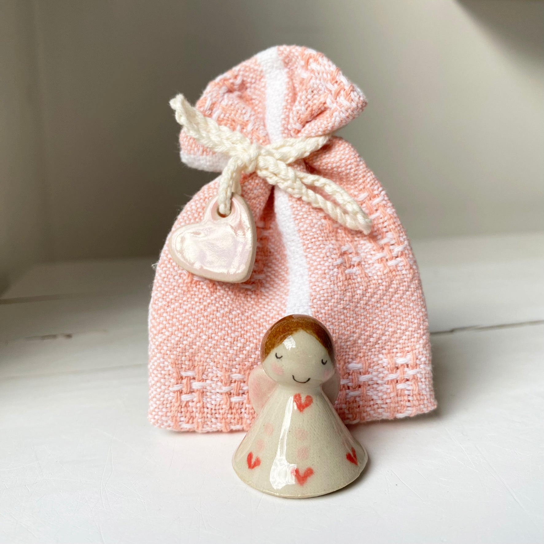 Vi har syet en stofpose til denne lille, bitte engel. Posens stof er lavet af gamle, smukke duge, som vi har købt på genbrug  💓 Vi har hæklet en bindesnor i en rest bomuldsgarn med et lille keramikmærke for enden af snoren.
