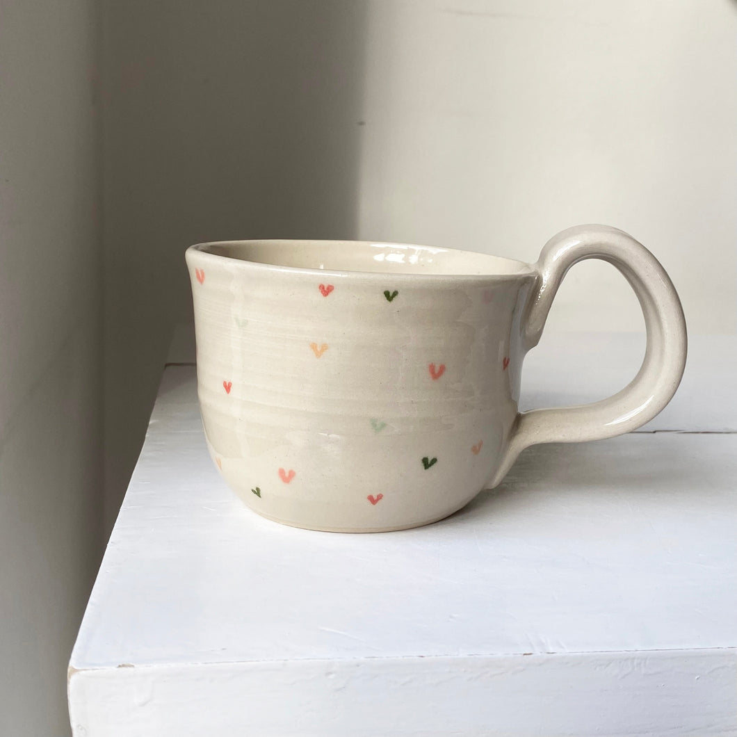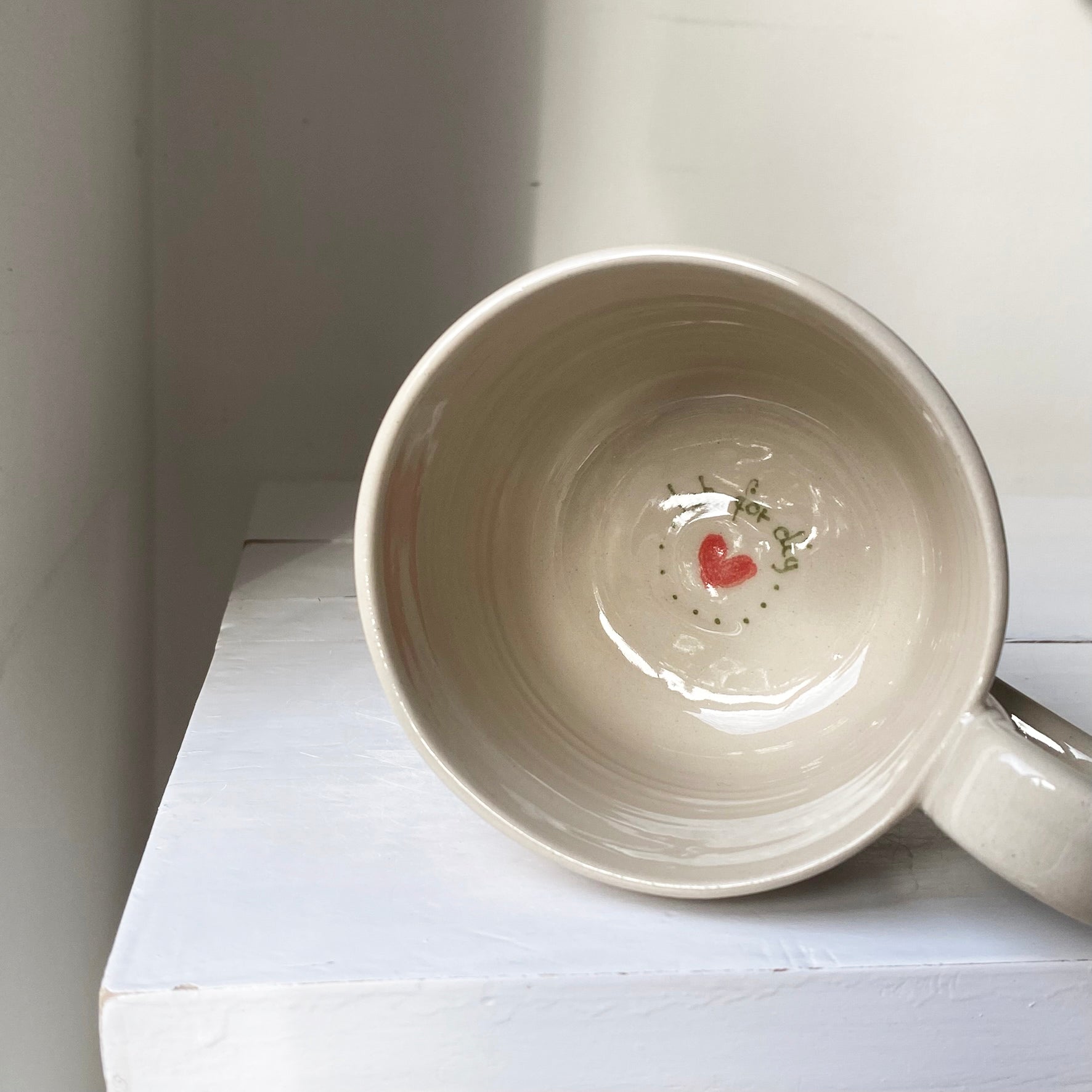 Vi har strøet en masse små fine små hjerter i alle farver ud over denne kop og skrevet "tak for dig" i bunden indeni.