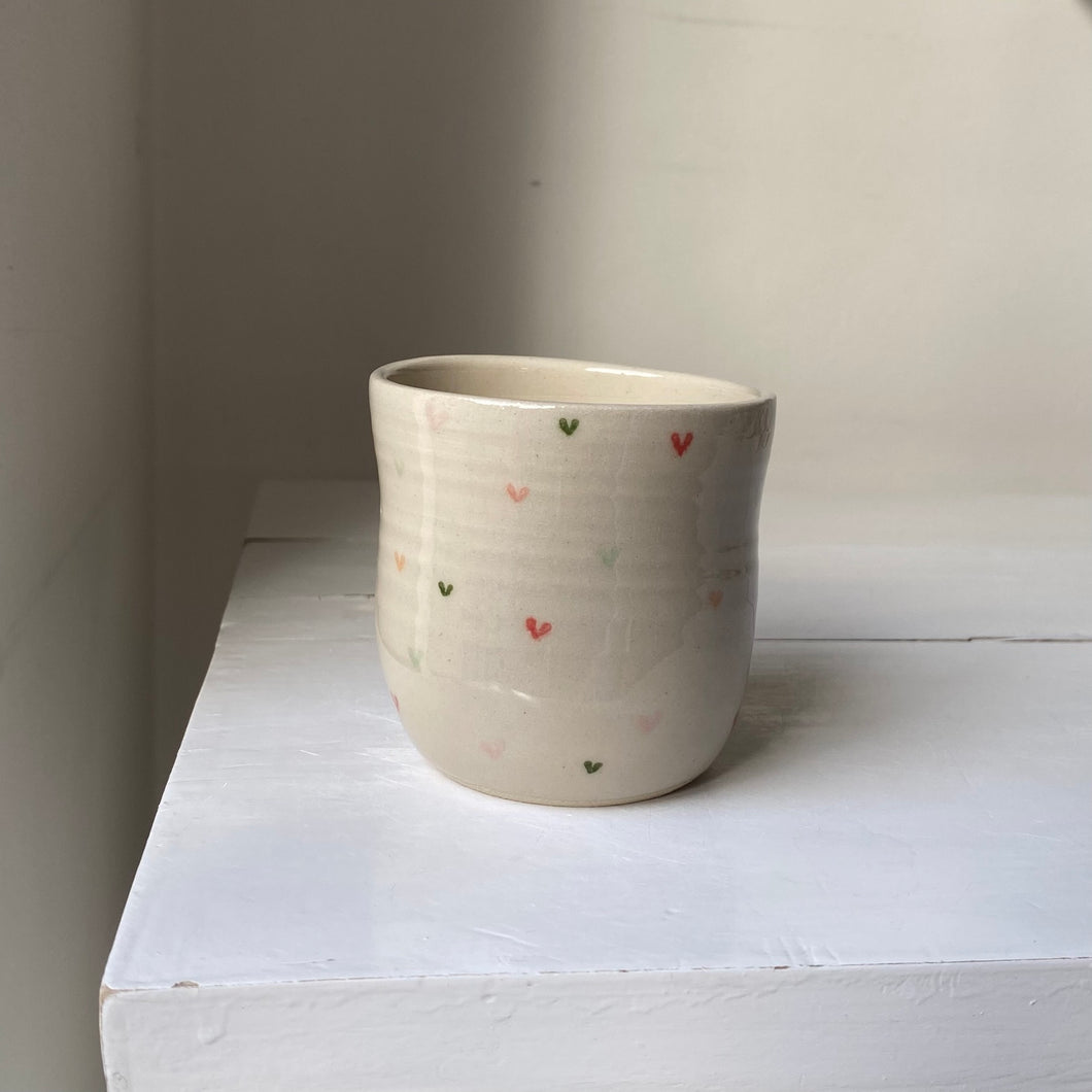 Vi har strøet en masse små fine små hjerter i alle farver ud over denne kop og skrevet "tak for dig" i bunden indeni.