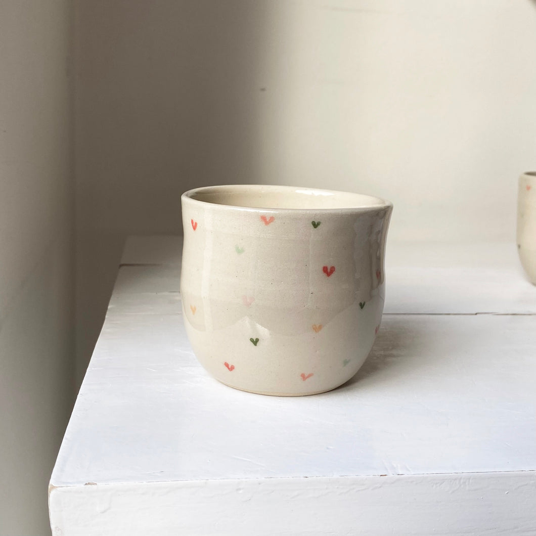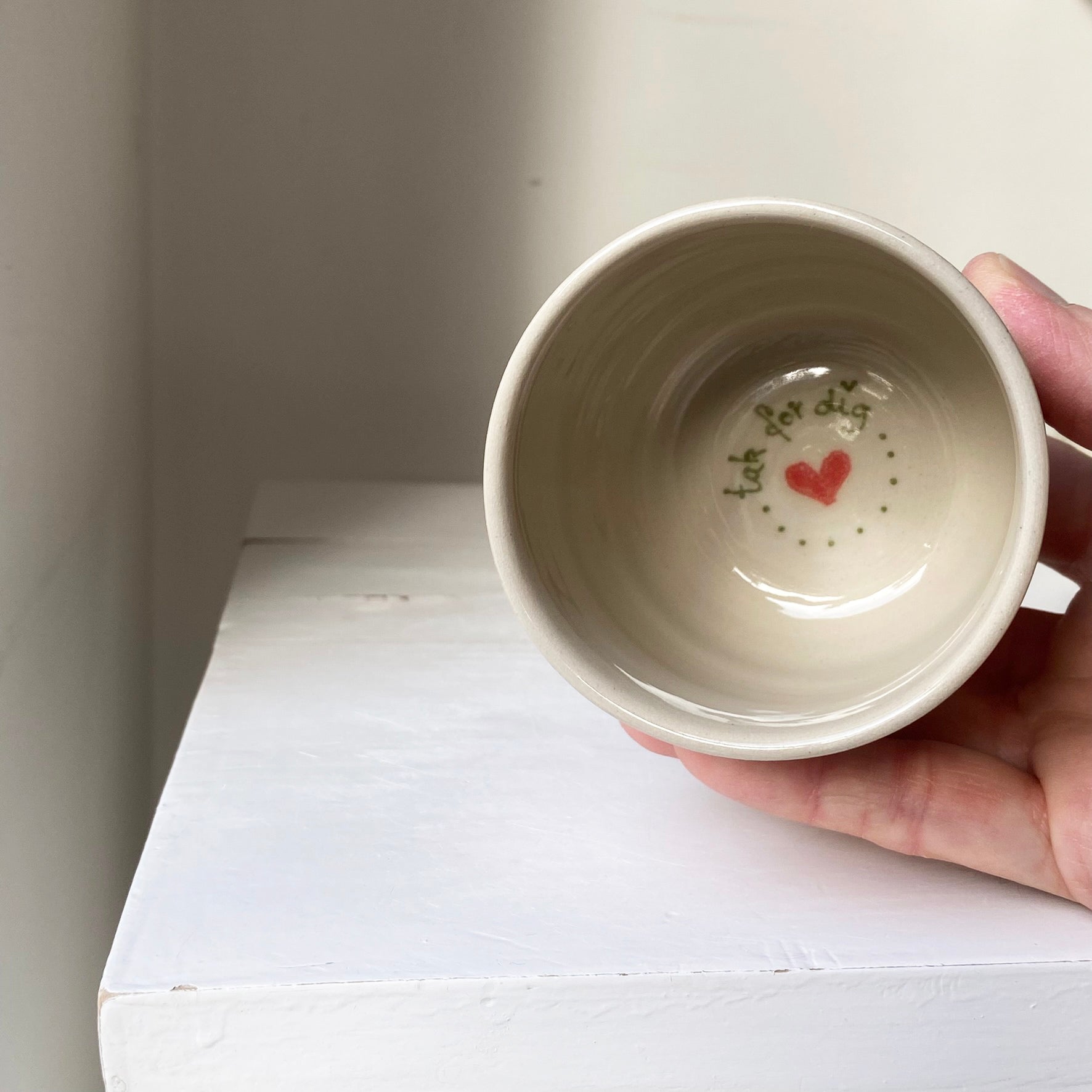 Vi har strøet en masse små fine små hjerter i alle farver ud over denne kop og skrevet "tak for dig" i bunden indeni.